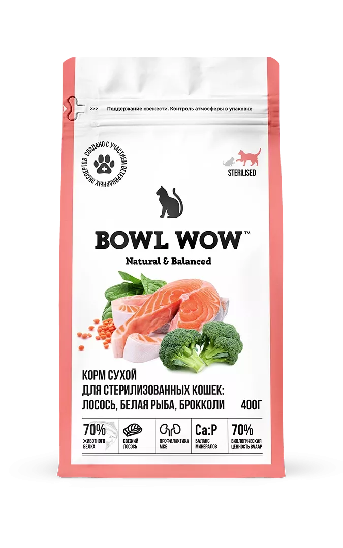 Bowl Wow Fresh Meat Сухой корм для стерилизованных кошек с лососем, белой рыбой и брокколи