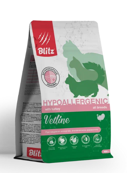 Blitz Hypoallergenic Диетический полнорационный сухой корм для кошек, способствующий уменьшению проявлений аллергических реакций и улучшению состояния кожи и шерсти. При пищевой аллергии, атопическом дерматите.