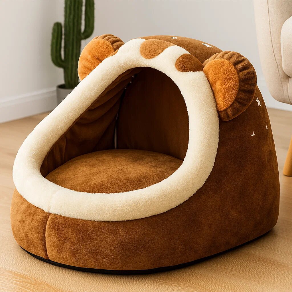 Плюшевый дом с пухлой вынимаемой подушкой на молнии. Шарик-дразнилка на резинке. Антискользящее дно.
