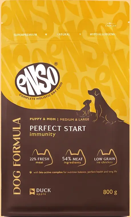 ENSO Dog Formula Perfect start – сухой полнорационный корм для щенков от 1 месяца, беременных и кормящих собак средних и крупных пород со свежей уткой с добавлением яблок.