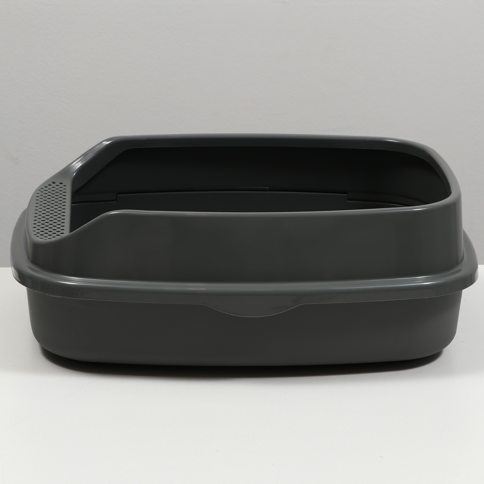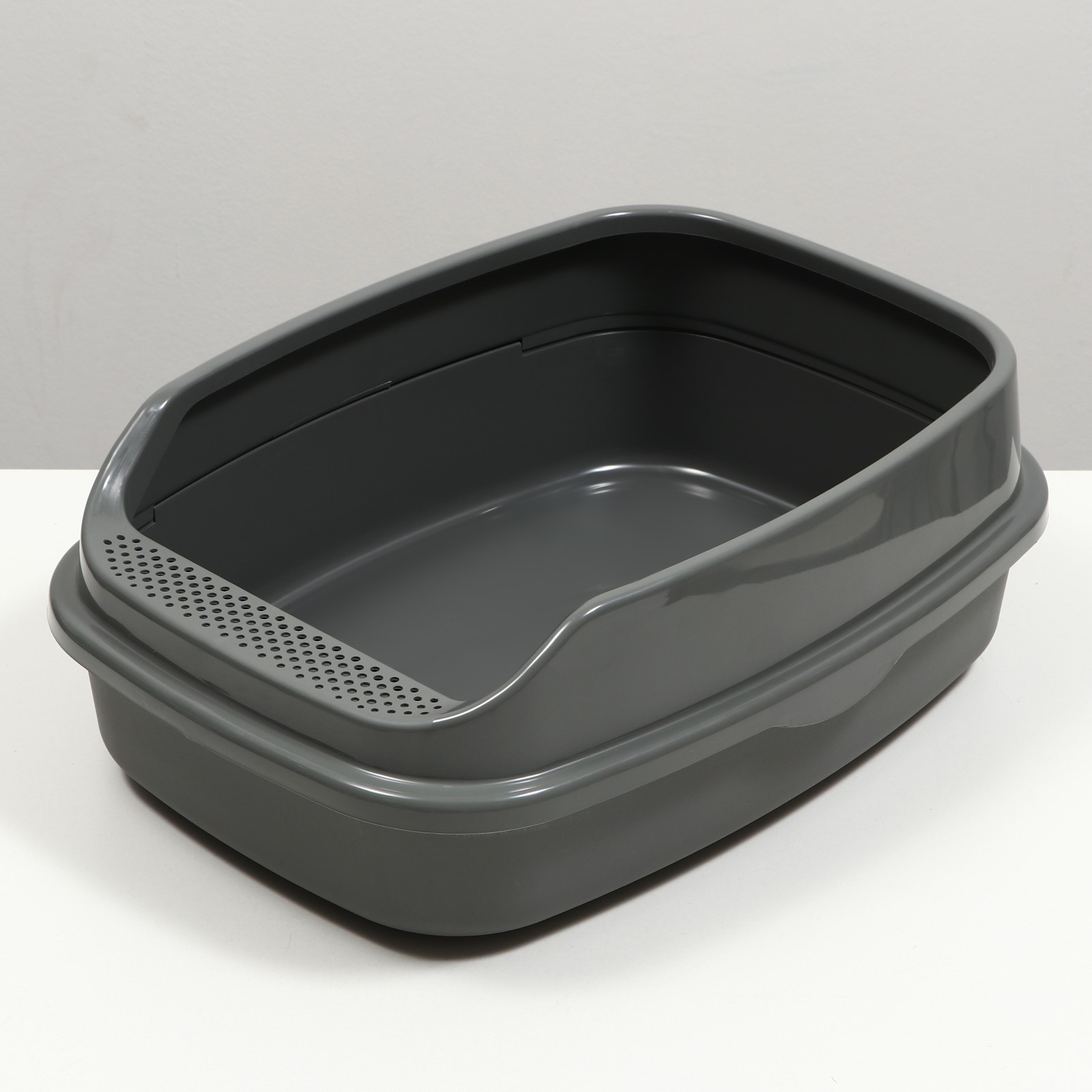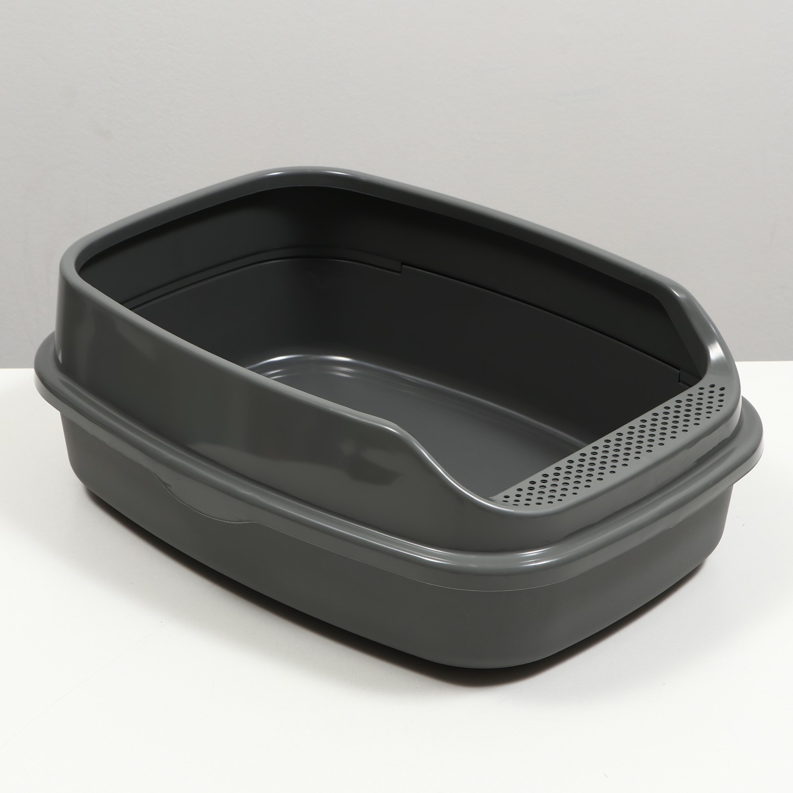 Пластиковый лоток для кошек с бортами удобен в использовании.