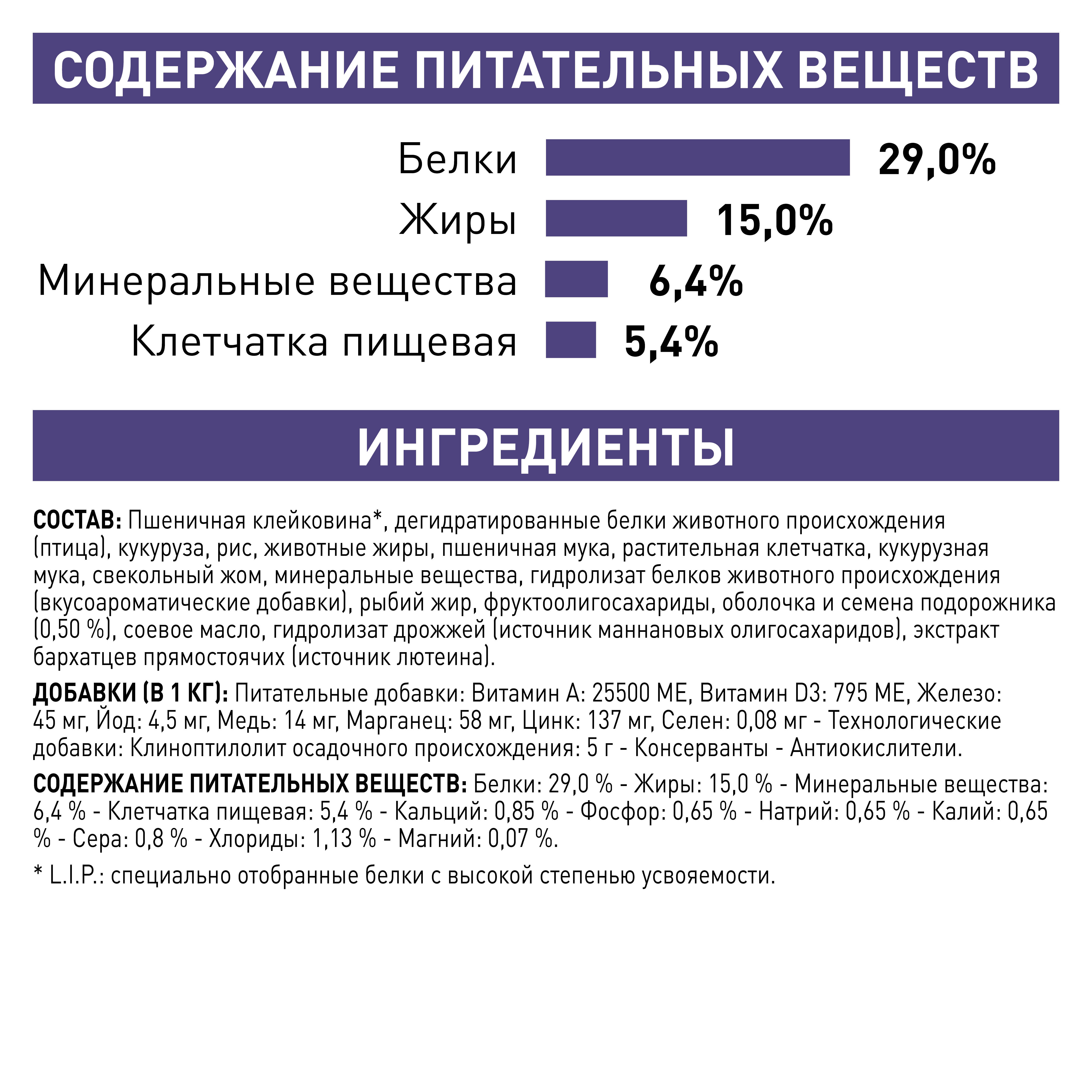 Ингредиенты: дегидратированные белки животного происхождения (птица), пшеничная клейковина*, рис, кукуруза, кукурузная мука, животные жиры, растительная клетчатка, минеральные вещества, свекольный жом, гидролизат белков животного происхождения (вкусоароматические добавки), рыбий жир, фруктоолигосахариды, соевое масло, оболочка и семена подорожника, гидролизат дрожжей (источник маннановых олигосахаридов), экстракт бархатцев прямостоячих (источник лютеина)* L.I.P специально отобранные белки с высокой степенью усвояемости.