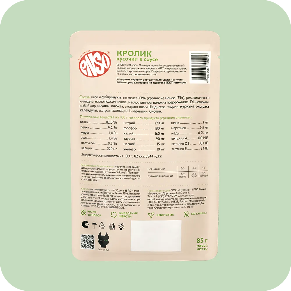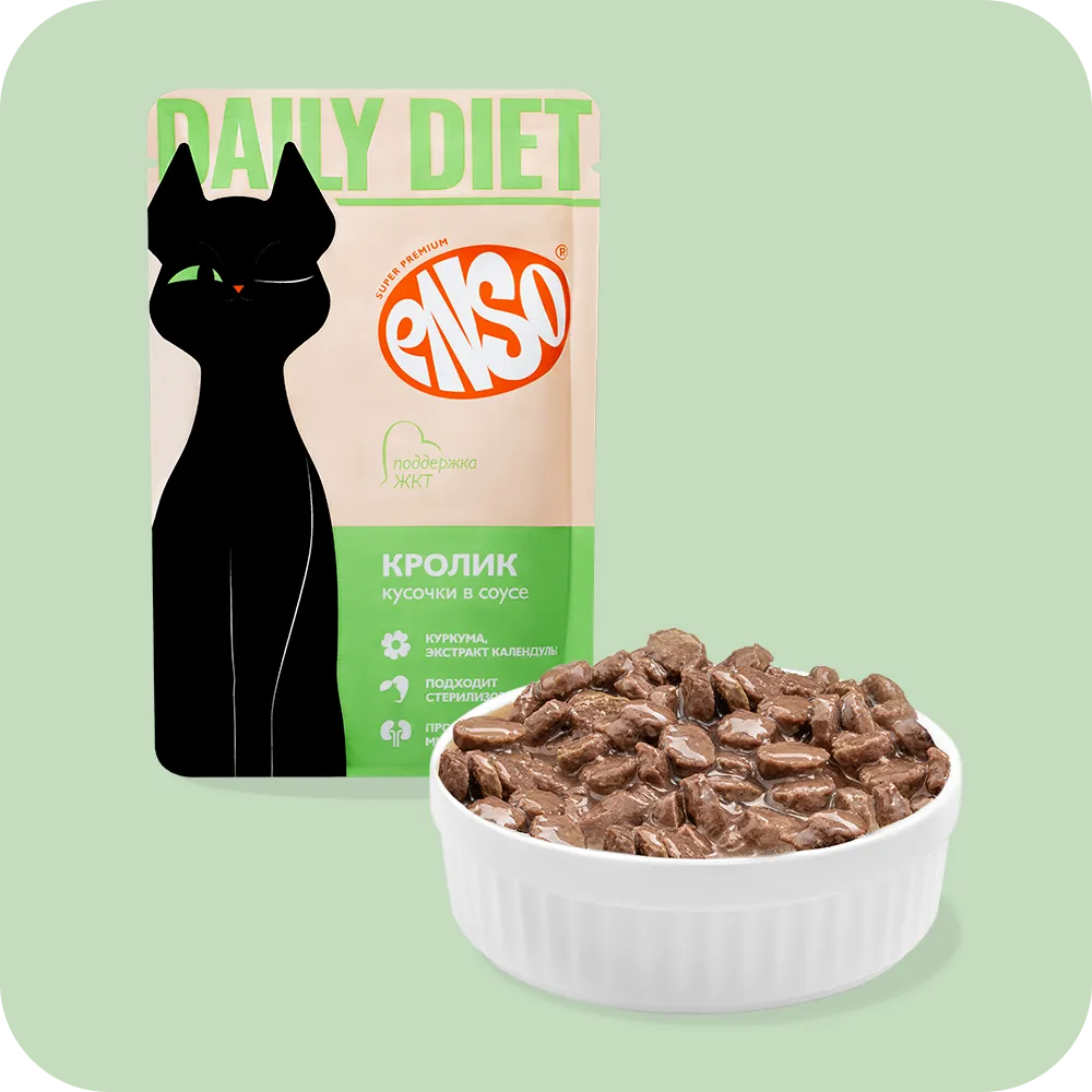 Enso Daily Diet Корм влажный полнорационный для взрослых кошек, здоровье ЖКТ, кусочки в соусе с кроликом, пауч 85р