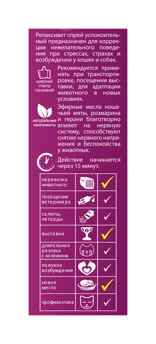 Успокоительный спрей Relaxivet благотворно влияет на нервную систему, способствует снятию нервного напряжения и беспокойства у животных, особенно при транспортировке, посещении выставок, адаптации к новым условиям.
