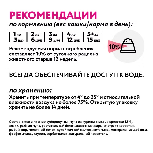 Состав: мясо и мясные субпродукты (мука из курицы, мука из креветки 12%), злаки, рыбная мука, растительный белок, животные жиры, экстракт креветки, рыбий жир, молочный белок, сухой яичный желток, витамины, минеральные добавки, фосфолипиды, таурин, сорбат калия, натуральный краситель.