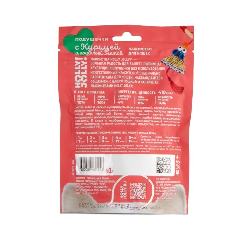 HOLLY JOLLY! — это хрустящие подушечки с нежным паштетом внутри. Идеальное угощение с курицей и кошачьей мятой для любителей ярких ощущений!
