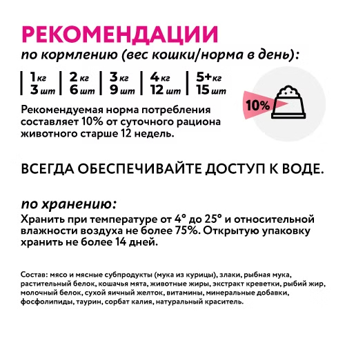 Состав: мясо и мясные субпродукты (мука из курицы), злаки, рыбная мука, растительный белок, кошачья мята, животные жиры, экстракт креветки, рыбий жир, молочный белок, сухой яичный желток, витамины, минеральные добавки, фосфолипиды, таурин, сорбат калия, натуральный краситель.