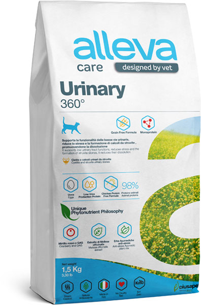 Alleva Care Urinary 360° — это полнорационный сухой диетический корм для взрослых кошек, предназначенный для растворения струвитных камней и предотвращения их рецидивов. Он также показан для поддержания здоровья мочевыводящих путей в случаях заболевания нижних отделов мочевыводящих путей кошек и кошачьего урологического синдрома.