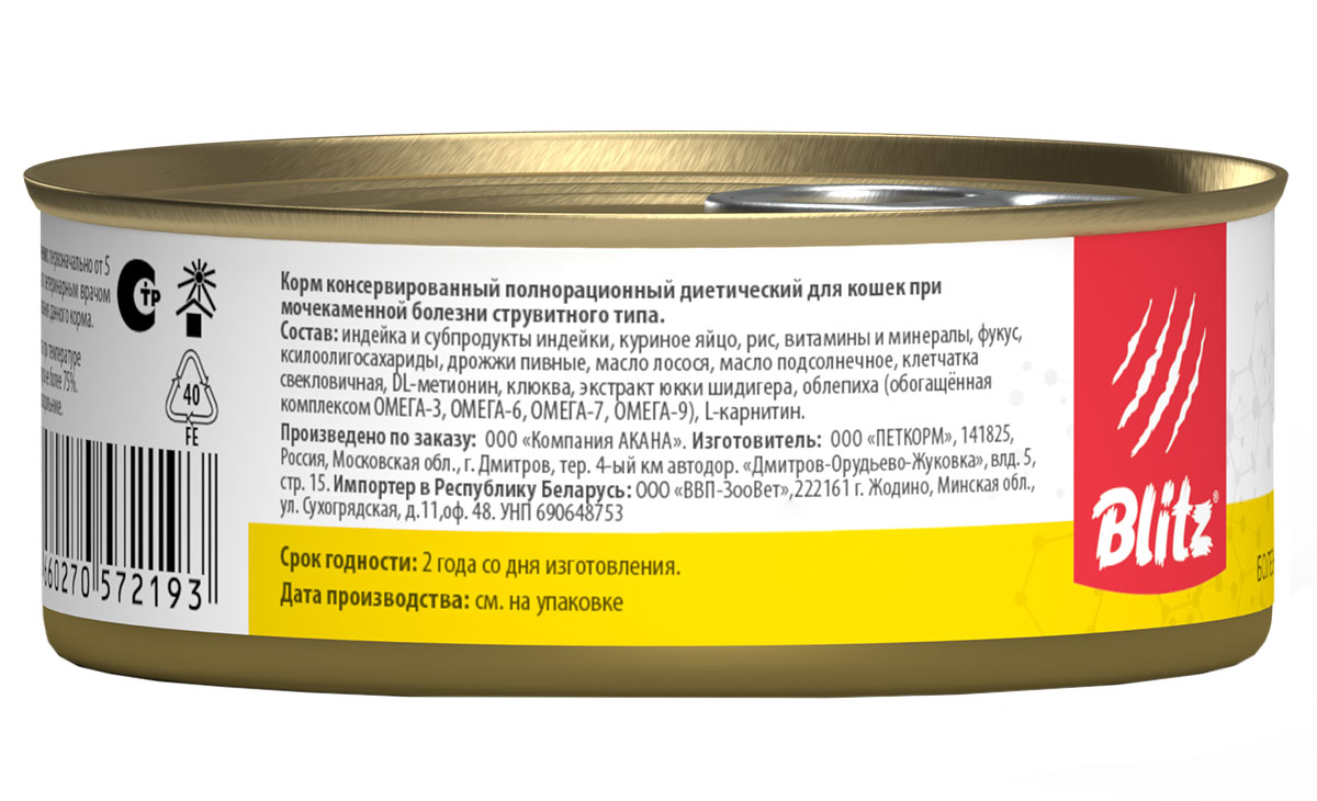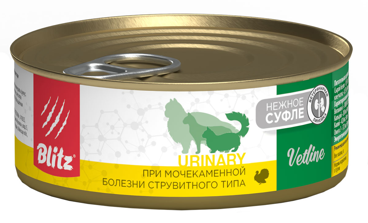 Консервированный корм Blitz Urinary — это не только нежнейшее суфле с восхитительным вкусом тушёной индейки и изысканным лососёвым маслом. Это незаменимая помощь кошкам, страдающим от возникновения уролитов струвитного типа — мочевых камней, формирующихся из осадков солей магния, фосфора и аммония. Наша ветеринарная диета направлена на растворение данных твёрдых фракций.