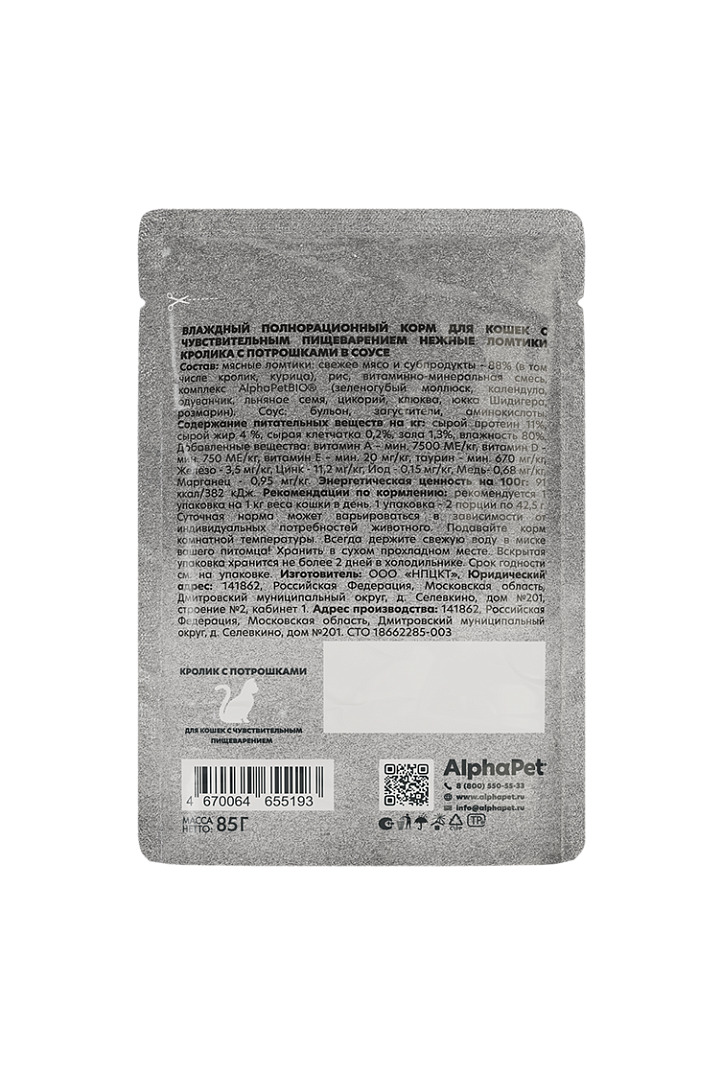 Влажный полнорационный корм Альфапет WOW Superpremium для кошек с чувствительным пищеварением кролик с потрошками нежные ломтики в соусе.