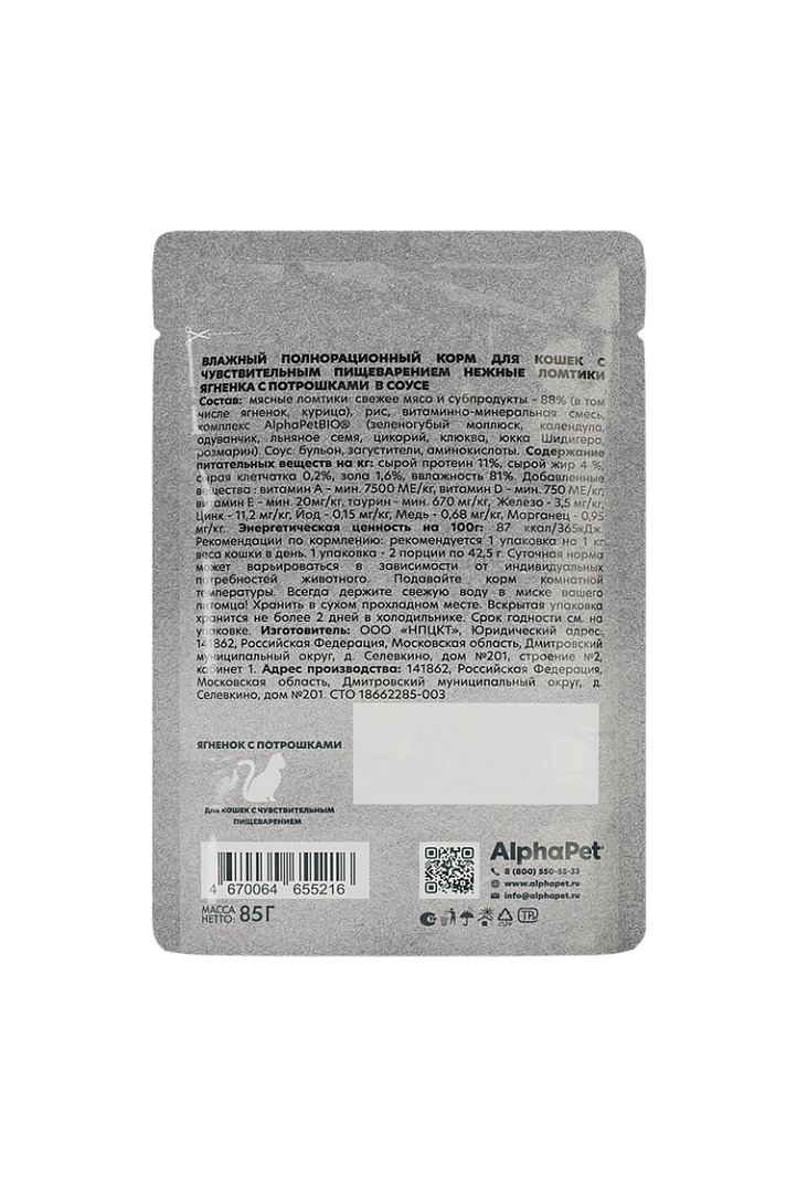Влажный полнорационный корм Альфапет WOW Superpremium для кошек с чувствительным пищеварением ягененок с потрошками нежные ломтики в соусе.