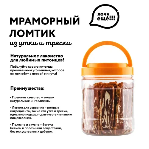 Гипоаллергенные мраморные ломтики из утки и трески – полезное и вкусное угощение для вашего питомца! Утка является диетическим мясом, богатым железом, а треска содержит Омега-3 кислоты, поддерживающие здоровье сердца и суставов. Нежная текстура и насыщенный вкус делают это лакомство любимым лакомством даже у собак с пищевой чувствительностью. Отличный способ разнообразить рацион вашего любимца полезными и вкусными угощениями.