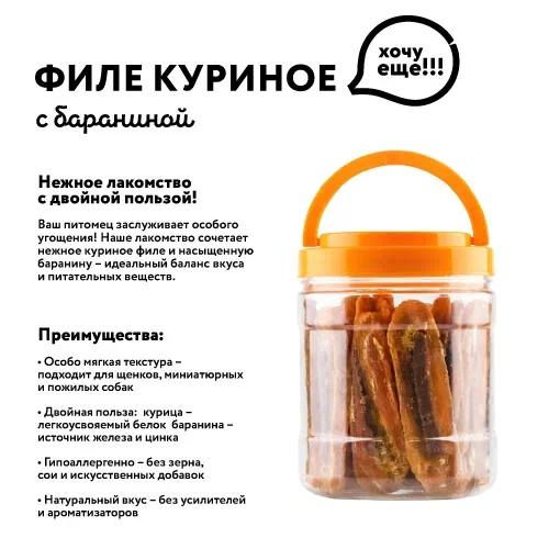 Смесь куриного филе и баранины – насыщенное белком и железом лакомство для активных собак! Баранина является ценным источником энергии, особенно полезным в холодное время года. Нежная текстура и приятный вкус делают это угощение любимым лакомством даже у самых привередливых питомцев. Идеальный вариант для восстановления сил после длительных прогулок и тренировок.