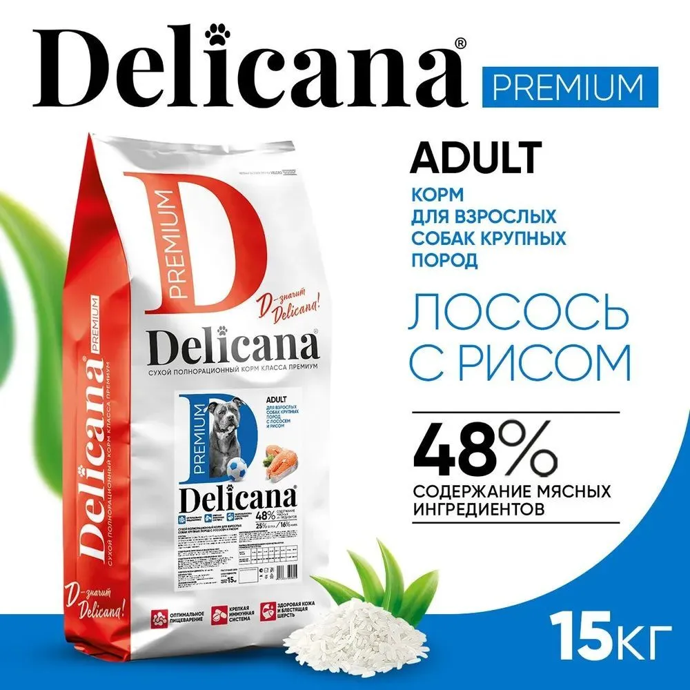 Delicana cухой полнорационный корм для взрослых собак крупных пород с лососем и рисом.