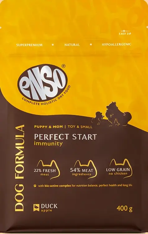 ENSO Dog Formula Perfect start – сухой полнорационный корм для щенков от 1 месяца, беременных и кормящих собак мелких и миниатюрных пород со свежей уткой с добавлением яблок.