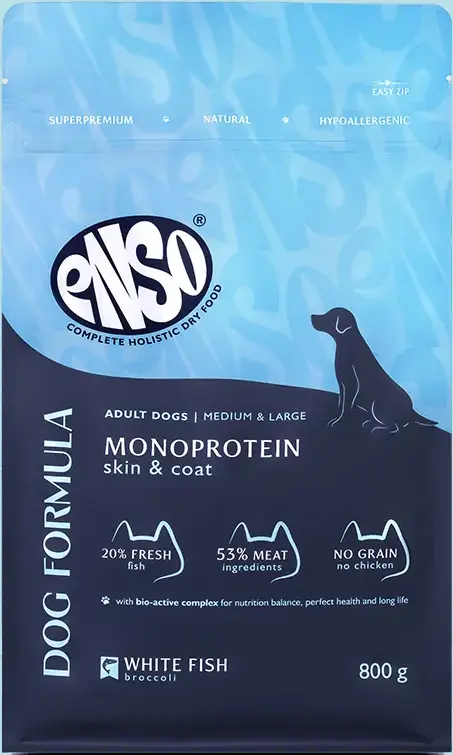 ENSO Dog Formula Monoprotein – сухой полнорационный корм для взрослых собак средних и крупных пород со свежей белой рыбой с добавлением брокколи.
