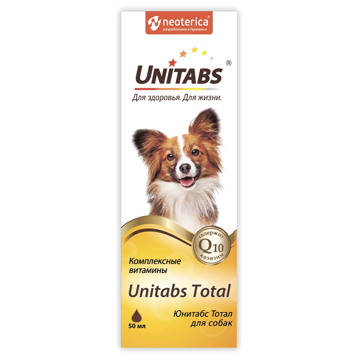 Unitabs Total — это витаминный комплекс для собак любых пород, который содержит коэнзим Q10 и все необходимые витамины для улучшения состояния кожи, шерсти, иммунитета питомца.
