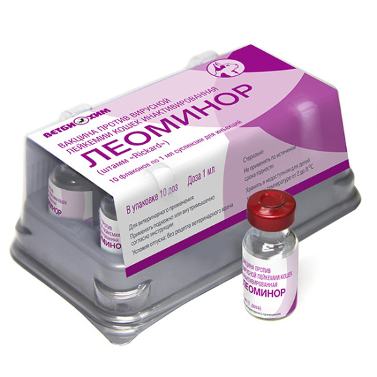Вакцина Леоминор - суспензия для инъекций против вирусной лейкемии кошек инактивированная. По внешнему виду вакцина представляет собой однородную непрозрачную жидкость от желтого до розового цвета, с сероватым оттенком, допускается выпадение незначительного осадка, легко разбивающегося при взбалтывании.